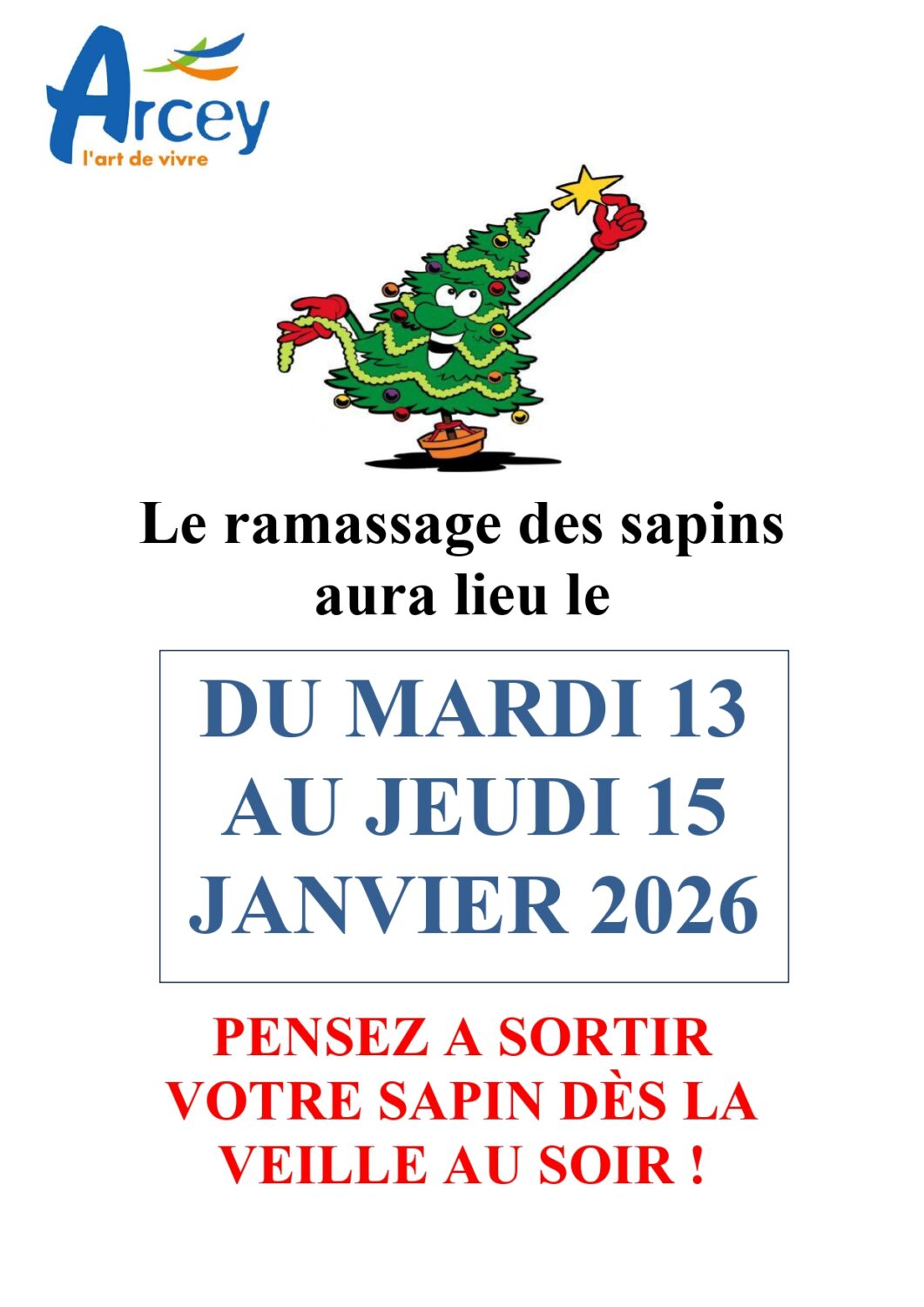 Pour faciliter le passage des équipes, merci de déposer votre sapin devant votre domicile dès le lundi 12 au soir.